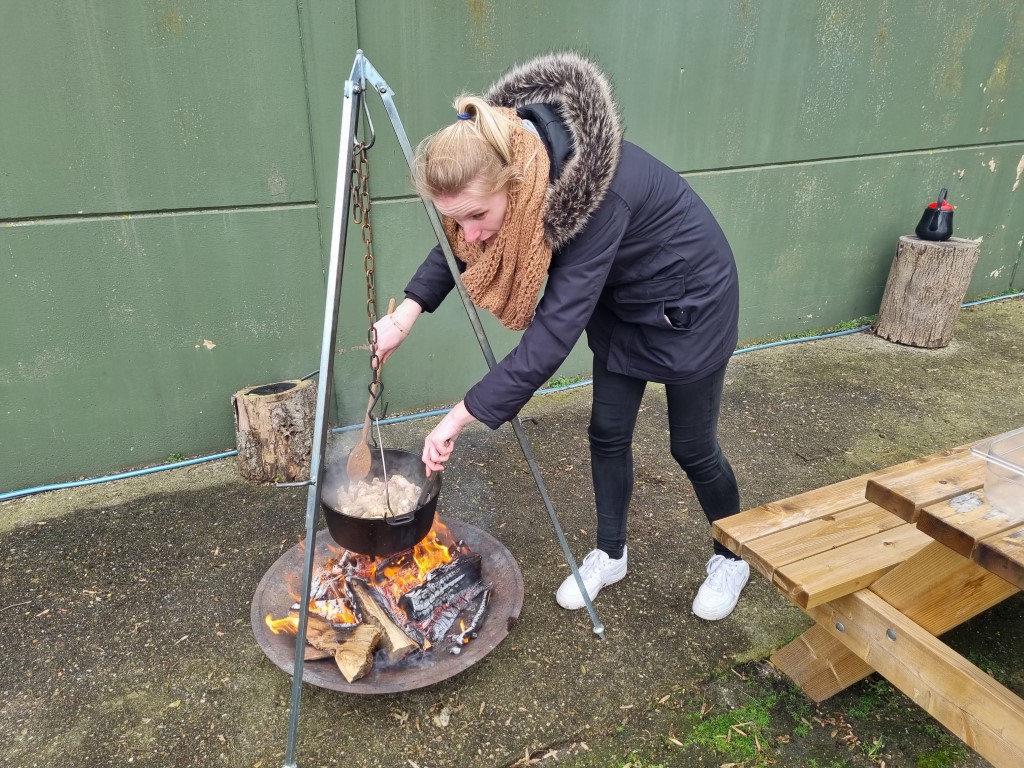 Ondertussen waren de andere groepen druk in de weer met hun eigen culinaire avonturen. Er werd een paddenstoelenbouillon bereid, vergezeld van heerlijk maisbrood. Een ander team creëerde een rijk gevulde lasagne, terwijl weer een ander een bonenschotel met speciaalbier klaarmaakte. Ook werden gegrilde ananas en broodpudding met amandelspijs en rumrozijnen bereid. Het was een orkest van heerlijke aroma’s en een visueel spektakel van koken in de open lucht, waarbij iedere groep zijn eigen melodie speelde.