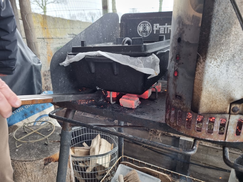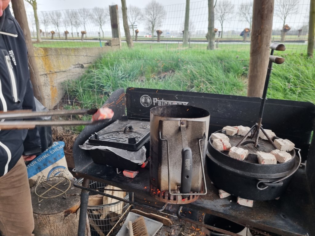Mijn partner en ik hadden de eer om de kippenstoof met witte wijn te bereiden. We begonnen met het bouwen van een solide vuur, waarboven onze Dutch oven kon hangen. Het vergde wat inspanning om de houtblokken op de juiste plek te krijgen, maar eenmaal aangestoken, brandde het vuur fel en standvastig