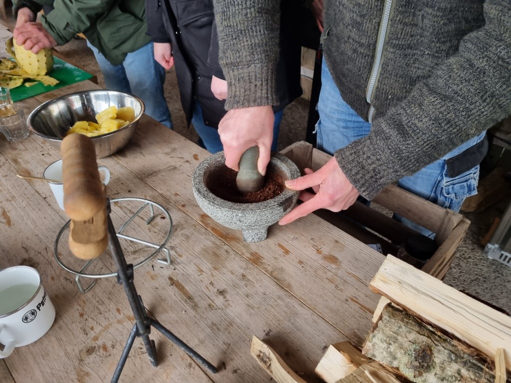 Bij onze aankomst voor de kookworkshop op houtvuur werden we warm ontvangen met een kopje koffie of thee, natuurlijk bereid op een knapperend buitenvuur en geserveerd in een traditionele percolator. We waren verdeeld in verschillende groepen en ieder van ons hing aan de lippen van de instructeur René, die ons geduldig de fijne kneepjes van het buitenkoken uitlegde. De wind had een gedempt effect op zijn stem, maar zijn enthousiasme was niet te missen.