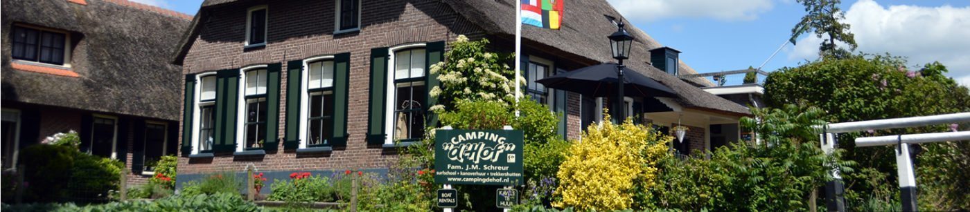 Camping d’Hof Giethoorn is gelegen direct aan het water. Aan de voorzijde van de camping loopt de Gieterse dorpsgracht met haar fraaie boerderijen en vele bruggetjes. Aan de achterzijde ligt het meer het Bovenwiede. De kindvriendelijke camping is dan ook een unieke locatie voor vakantie voor familie en watersportliefhebbers.